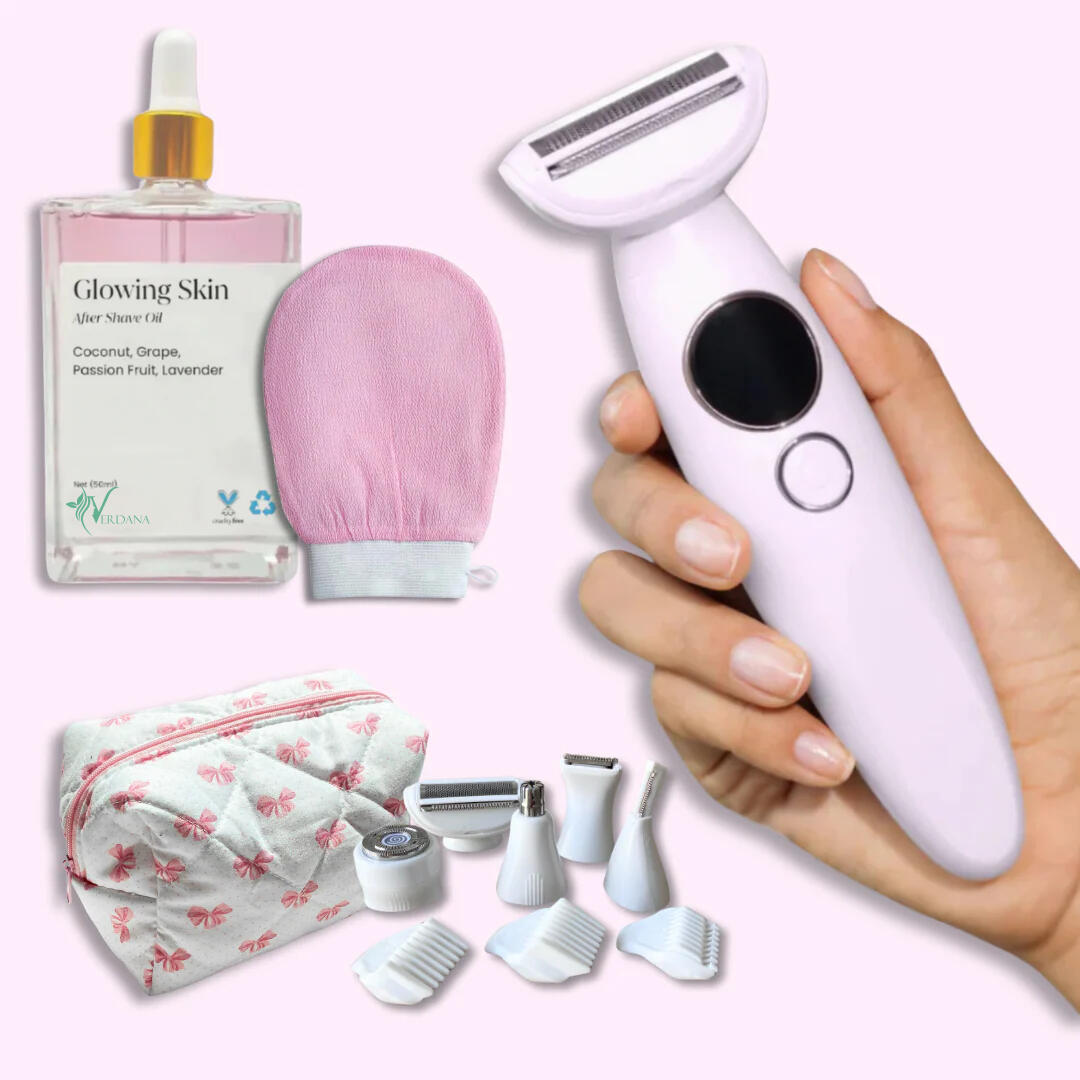 Step into radiance with the Verdana Goddess Grooming Kit, a complete set designed to give you the smoothest, softest skin all season long. This indulgent kit includes a precision razor for a close, effortless shave, a rich foaming shaving cream that cushions and protects, an exfoliating scrub to polish and prep your skin, and a nourishing after-shave lotion that hydrates and soothes for an irresistible glow. Together, these essentials transform shaving from a chore into a goddess-worthy ritual of beauty, confidence, and self-care.