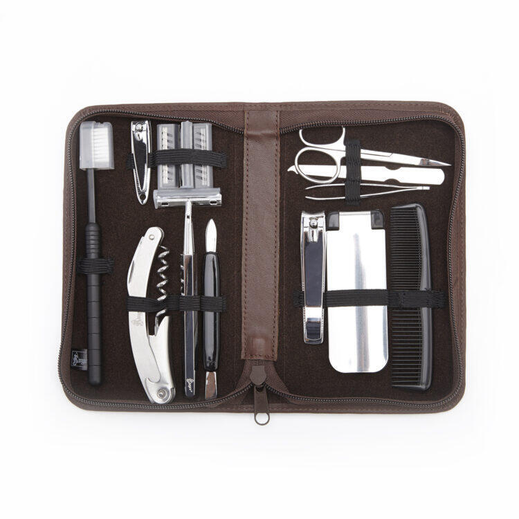 The Verdana Portable Grooming Essentials Set is a curated selection of high-quality grooming tools, including manicure essentials: an elegant hexagon razor with twin-pack blades, handy nail clippers, a useful corkscrew knife combo, a toothbrush, nail file, comb, tweezers, scissors, pusher, comb, and shoehorn lint brush — everything you need to maintain a polished appearance on the go. Each tool is securely stored in dedicated compartments, keeping them organized and easily accessible.