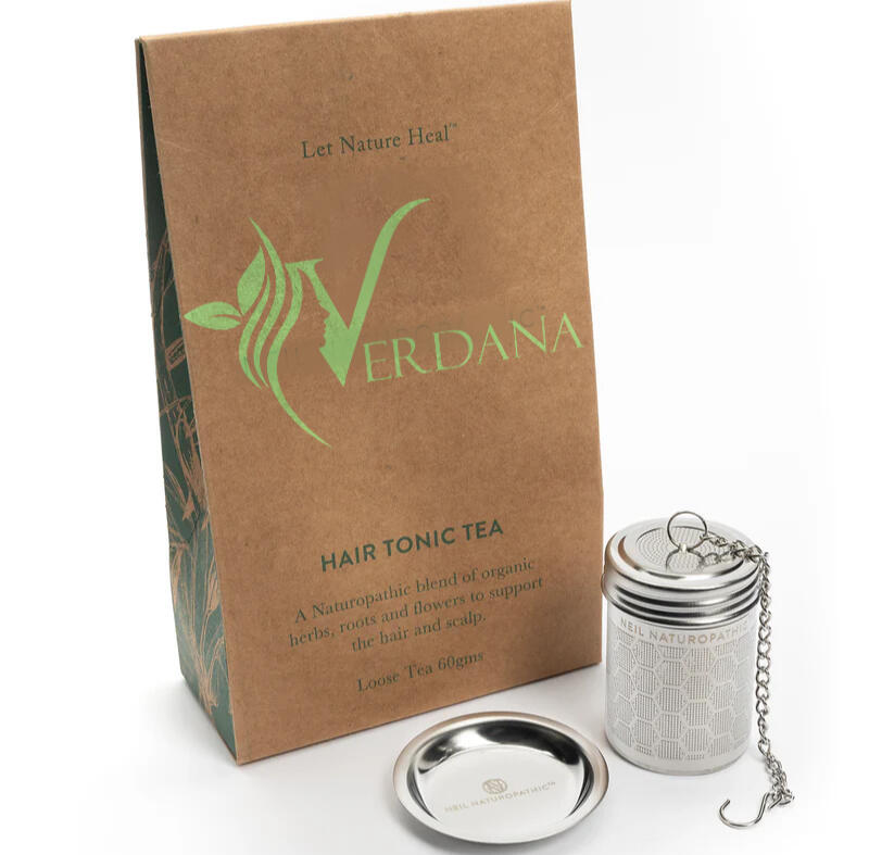 The Verdana Hair Tonic Tea & Tea Canister — A soothing infusion crafted to nurture beauty from the inside out. This aromatic herbal blend offers delicate notes of mint, chamomile, and lemongrass, balanced with the earthy warmth of nettle and rosemary. Each sip supports healthy hair growth, scalp circulation, and overall vitality, delivering vitamins and antioxidants that strengthen from root to tip. Housed in a beautifully reusable canister to preserve its natural freshness, this tonic tea transforms your wellness ritual into a fragrant moment of calm and rejuvenation.