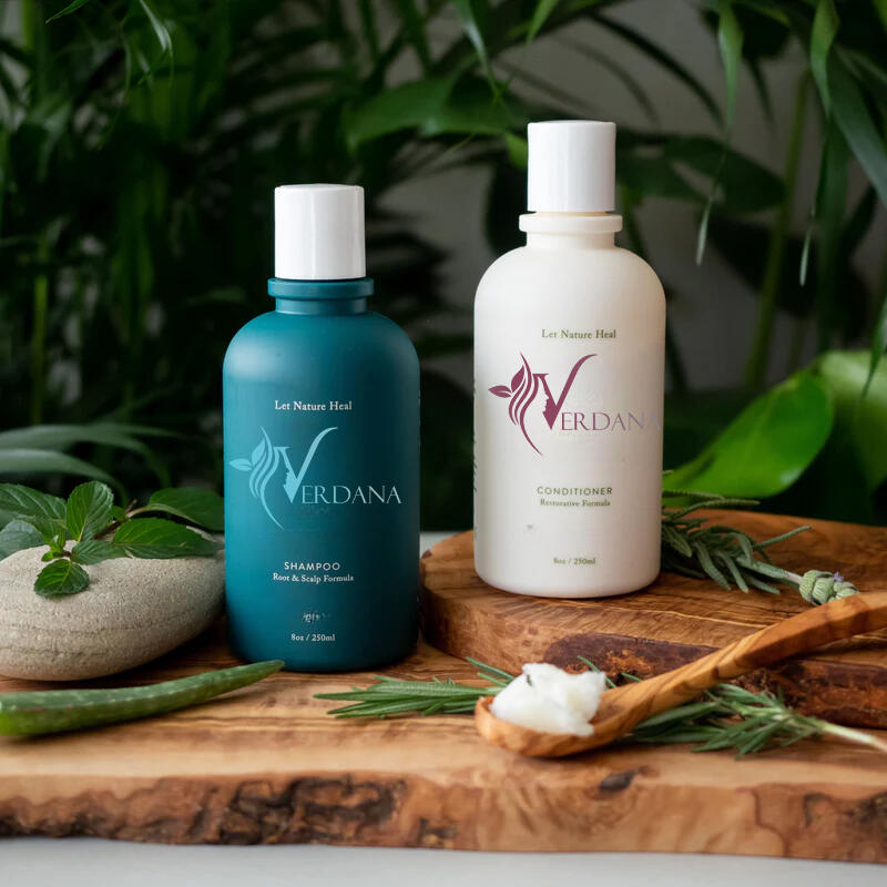 The Verdana Revitalization Duo — Restore harmony and strength from root to tip with this holistic care duo. The Root & Scalp treatment features refreshing notes of peppermint, cedarwood, and rosemary, formulated to awaken the scalp, boost circulation, and encourage healthy, balanced growth. The Restorative treatment offers calming aromas of lavender, jasmine, and vanilla, deeply hydrates and smooths each strand, and replenishes essential nutrients. Together, they deliver a complete natural ritual that revitalizes the scalp, repairs the hair, and leaves it soft, radiant, and full of life.