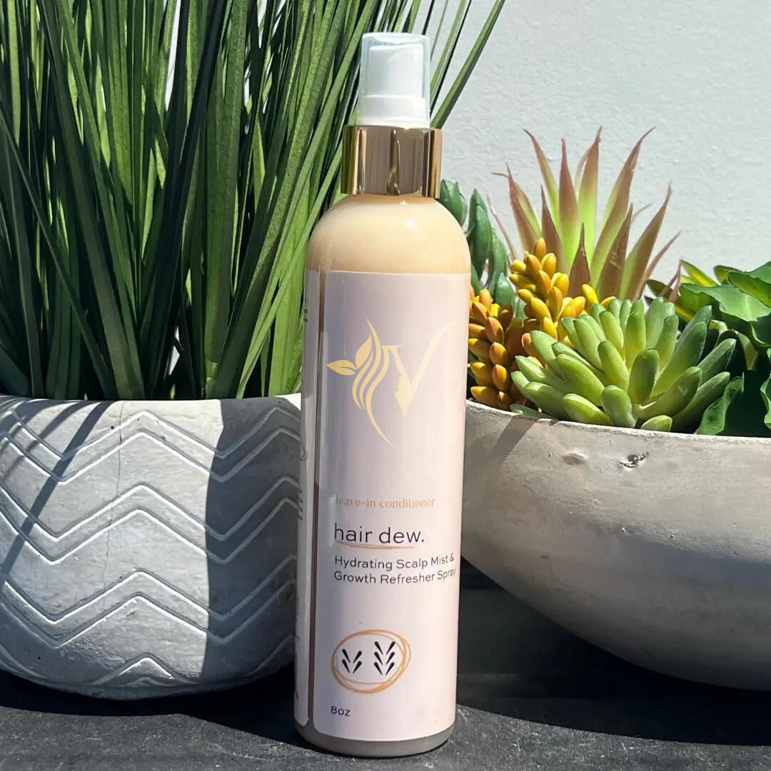 The Verdana Hair Dew — Restore balance and hydration with this lightweight, fast-absorbing leave-in, formulated explicitly for low-porosity hair. Infused with aloe vera, jojoba oil, and marshmallow root, it penetrates deeply without buildup, softening strands and enhancing natural shine. Perfect for daily moisture and detangling, it smooths frizz, boosts manageability, and keeps hair feeling refreshed and nourished—a breathable dew for soft, healthy, and beautifully hydrated hair.