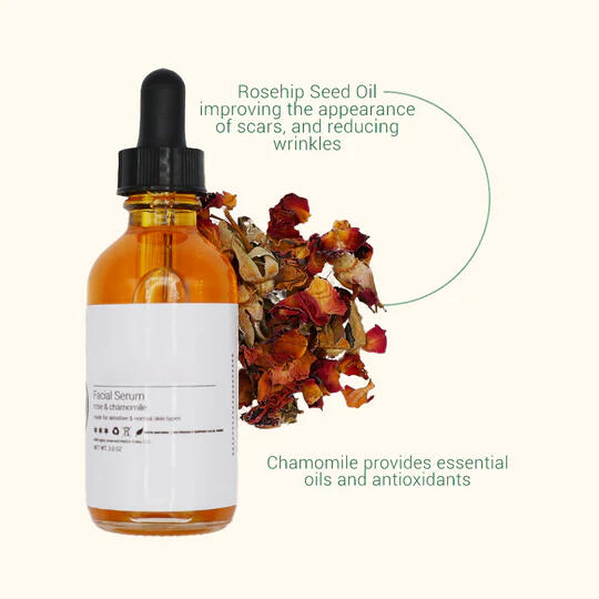 Nourish and glow with the Rose & Chamomile Facial Serum. Crafted with soothing chamomile and rejuvenating rose, this gentle serum calms irritation, softens skin, and enhances your natural radiance. Ideal for sensitive or dry skin, it delivers deep hydration with a touch of botanical luxury.