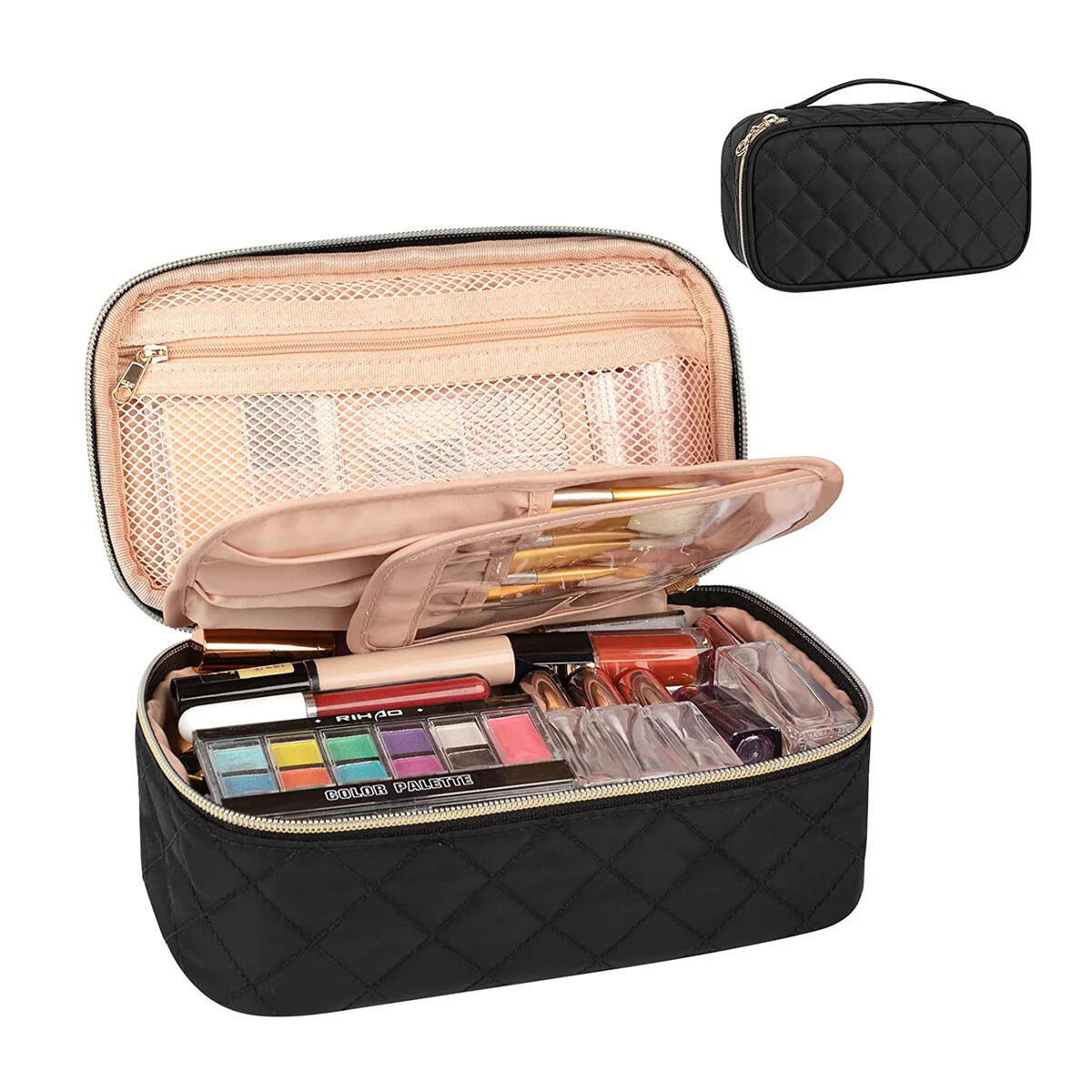 The Portable Vanity Bag is your go-to beauty companion — compact enough to fit in your tote, yet spacious enough to carry your must-haves in style.Wrapped in a luxe quilted rhombus design, this sleek black bag doesn't just hold your makeup — it elevates your entire routine. With thoughtfully designed compartments and durable, travel-ready materials, it keeps your products organized, protected, and always within reach.