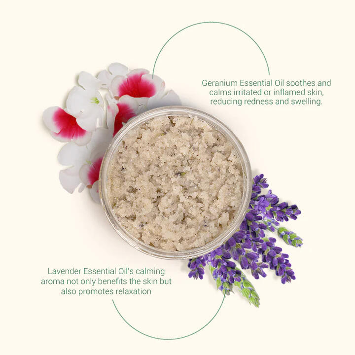 Relax and renew with the Lavender & Geranium Body Scrub. This calming blend of mineral-rich exfoliants and soothing essential oils gently buffs away dead skin while promoting softness, balance, and tranquility. Perfect for winding down—naturally smooth skin and a peaceful mind in every scrub.
