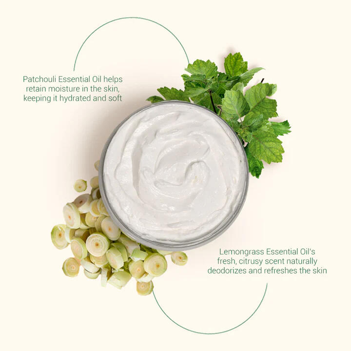 Nourish your skin and indulge your senses with Lemongrass & Patchouli Body Butter. This whipped, plant-based moisturizer melts in deeply to hydrate and soften, while bright lemongrass uplifts and earthy patchouli grounds—leaving your skin smooth, radiant, and luxuriously scented all day long.