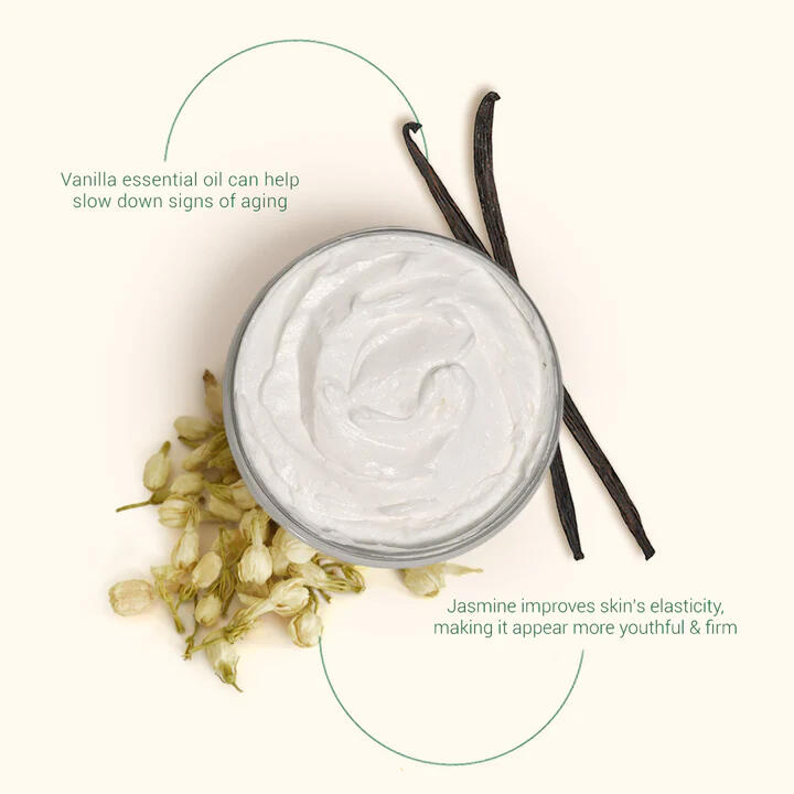 Indulge your skin and your senses with the Jasmine & Vanilla Body Butter—a rich, plant-based blend that melts in for deep hydration and silky softness. The romantic floral-sweet aroma of jasmine and vanilla turns every application into a moment of self-care, leaving your skin nourished, radiant, and luxuriously scented.