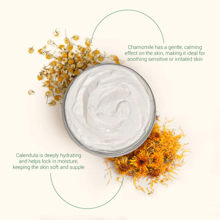 Soothe and restore your skin with the Chamomile & Calendula Body Butter—a gentle, whipped blend that calms irritation, locks in moisture, and nourishes deeply. Infused with the healing power of chamomile and calendula, this plant-based moisturizer is perfect for sensitive or dry skin, leaving it soft, balanced, and naturally radiant.