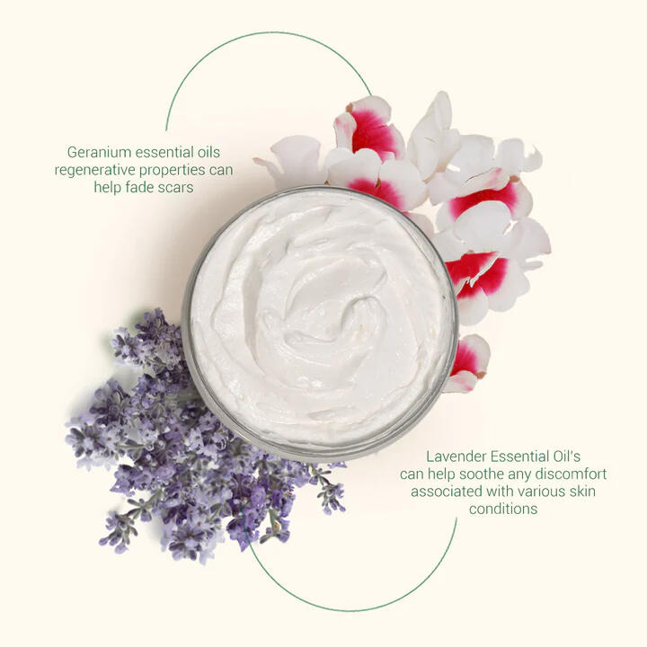 Bring harmony to your skin and senses with the Lavender & Geranium Body Butter—a luxuriously whipped blend that deeply hydrates while calming and uplifting your mood. Lavender soothes, geranium balances, and together they leave your skin silky-soft, nourished, and beautifully refreshed.